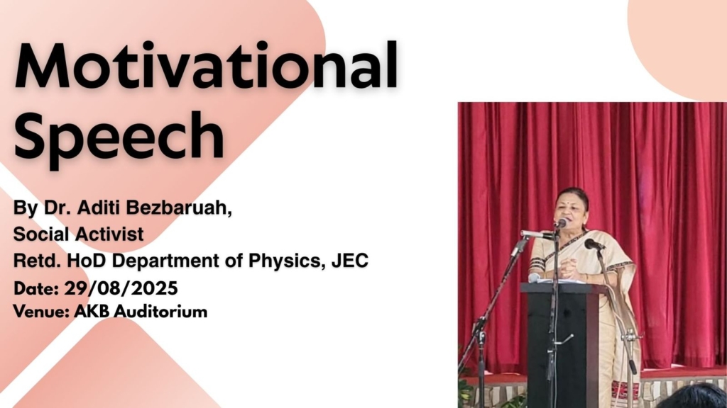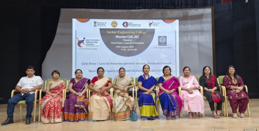 On 29th August 2025, during the Induction Program at Jorhat Engineering College, Dr. Aditi Bezbaruah, Social Activist and Retd. HOD, Department of Physics, JEC, delivered a Motivational Speech, followed by a Talk on Girls’ Power: Laws for Protection by Advocate Mandakini Goswami. The event was organised by the Women Cell, JEC